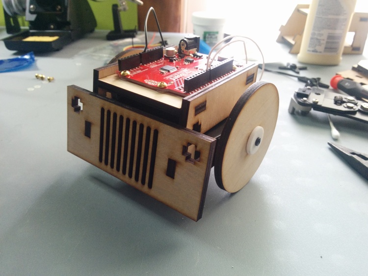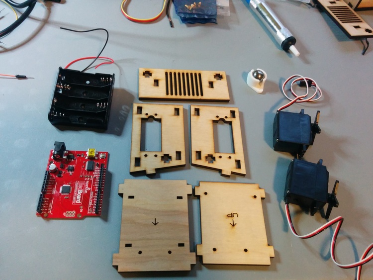 The local maker spaces in my area don’t have a laser-cutter so I used Ponoko to laser-cut plywood frames and wheels. The Github repository has cutting plans ready to order from Ponoko.
